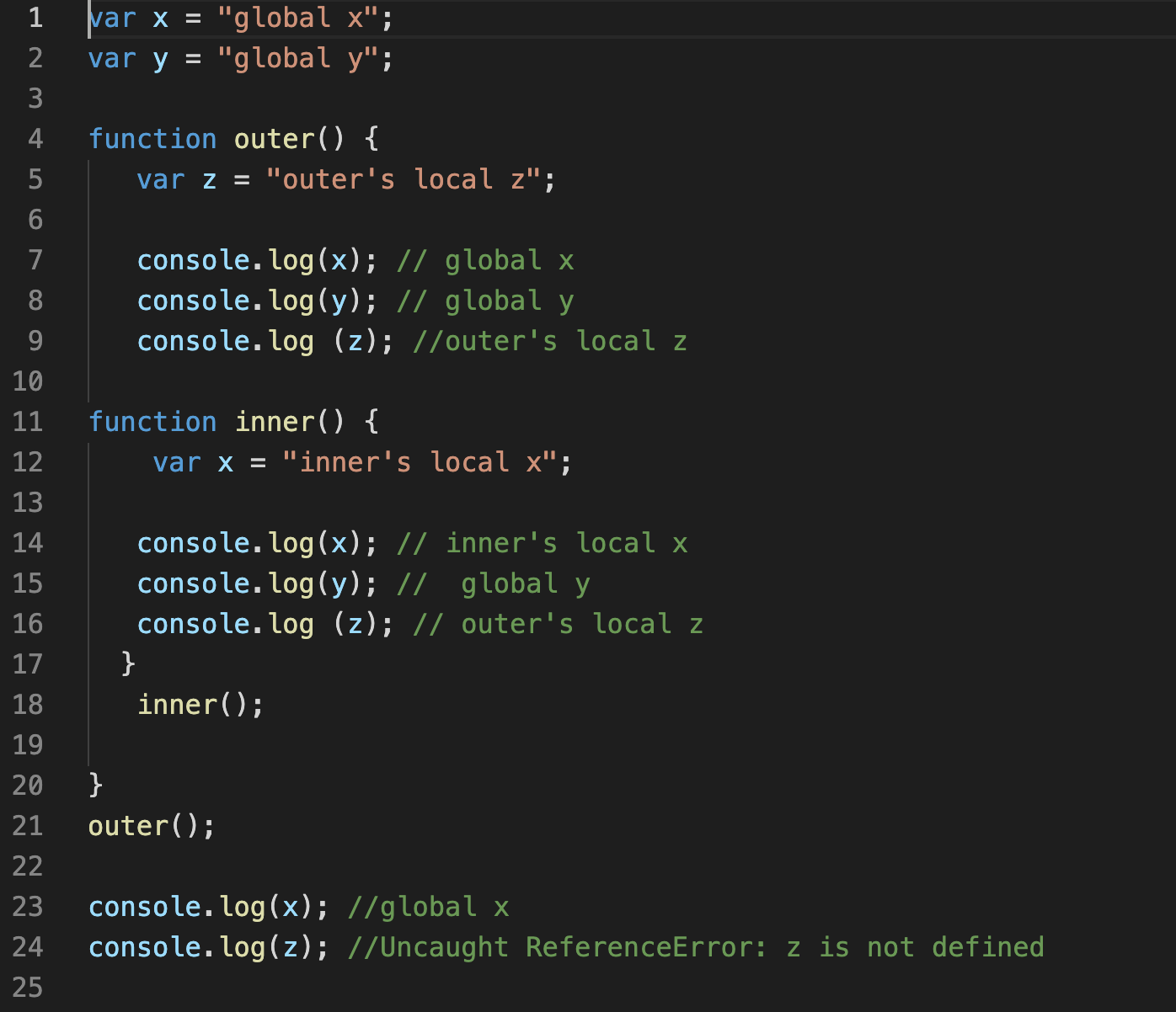 위 코드에서 outer 함수 내부에서 선언된 z변수와 inner 함수 내부에서 선언된 x 변수는 지역 변수이다. 지역 변수 z를 전역에서 참조하면 참조 에러가 발생된다. 지역 변수 x의 경우에도 전역 또는 inner 함수 내부 이외의 지역에서 참조하면 참조 에러가 발생된다.