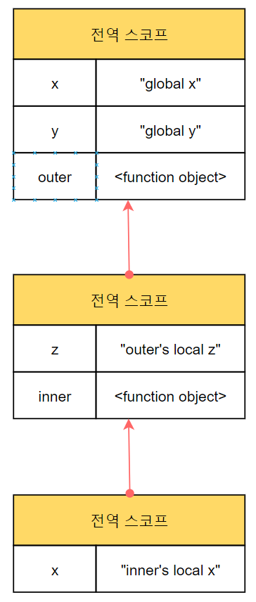 모든 스코프는 하나의 계층적 구조로 연결되며, 모든 지역 스코프의 최상위 스코프는 전역 스코프이다. 스코프가 이렇게 계층적으로 연결된 것을 스코프 체인이라고 한다. 아래 그램에서 스코프 체인은 최상위 스코프인 전역 스코프, 전역에서 선언된 outer 함수의 지역 스코프, outer 함수 내부에서 선언된 inner 함수의 지역 스코프로 이루어진다.