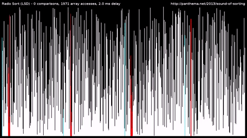 데이터의 비교를 통한 정렬이 아닌 분산 정렬을 이용한 정렬 방법이며 자릿수가 있는 데이터(정수, 문자열 등)에만 사용 가능하다. 각 자리수를 기준으로 점차 정렬을 진행한다.